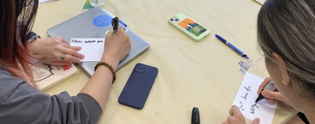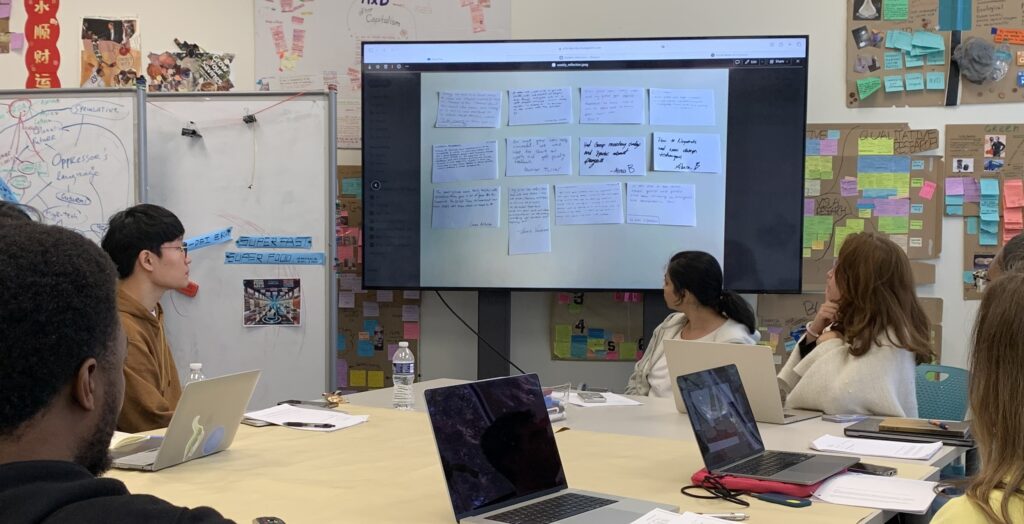 Before turning in the full assignment, students are prompted to write reflective notes on a card right after experiencing key turning points in the studio experience: project definition, field study presentations, user testing results, and other moments. Later, they can use these cards as drafts for their final reflective writing. The cards can also be discussed to find patterns and generative themes among students and their projects, which can be thematized in the final writing as well.