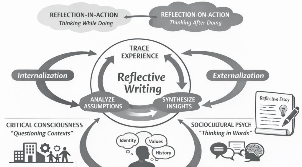 Reflective writing puts reflection-on-action on equal weight to reflection-in-action: a temporally detached, analytical stance that turns experience into explicit, interrogable knowledge that can be shared, debated, and extended by studio peers and instructors.